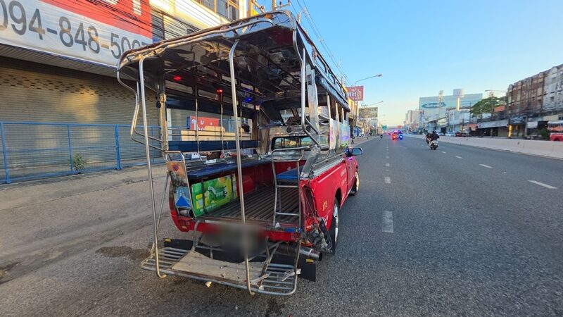 พ่อค้าขับกระบะ หลับใน เสียหลักพุ่งเสยท้ายสองแถวเต็มแรง รถหมุนเคว้ง เด็กนักเรียน-ชาวบ้าน กระเด็นตกรถบาดเจ็บระนาวเกลื่อนถนน 14 ราย